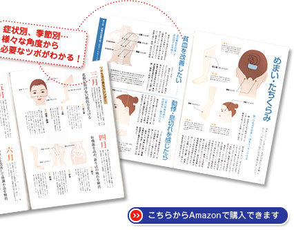 | サイズはB5版で、全144ページカラーイラスト入りの)とてもキレイで見やすい本です(¥1,050)。 鍼はちょっと…という方も、ツボ押しなら自分でやれるから大丈夫でしょう? ぜひお買い求めの上、お手にとってお試し下さい! |
